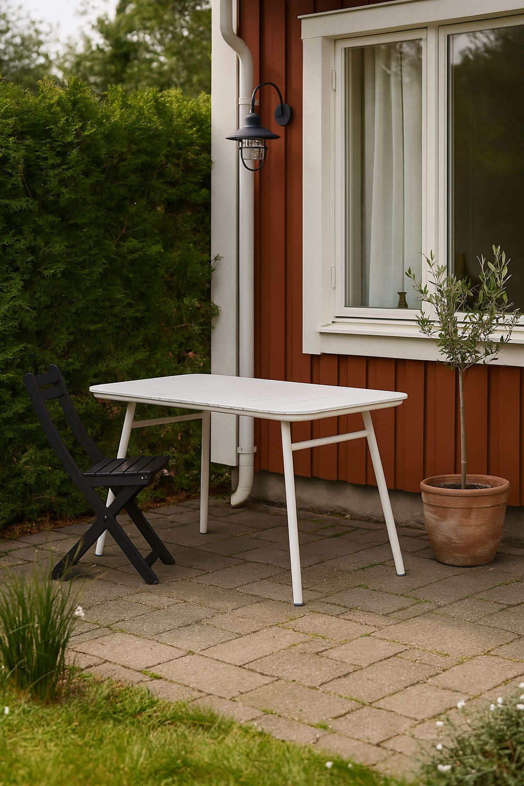 Bordsskivan är tillverkad av slitstark aintwood och vilar på en stabil vitlackad metallstomme, vilket gör bordet både väderbeständigt och underhållsfritt. De stapelbara stolarna är tillverkade i samma hållbara material och följer bordets rena designlinjer. Tillsammans skapar de en funktionell och stilren utegrupp som rymmer hela sällskapet.