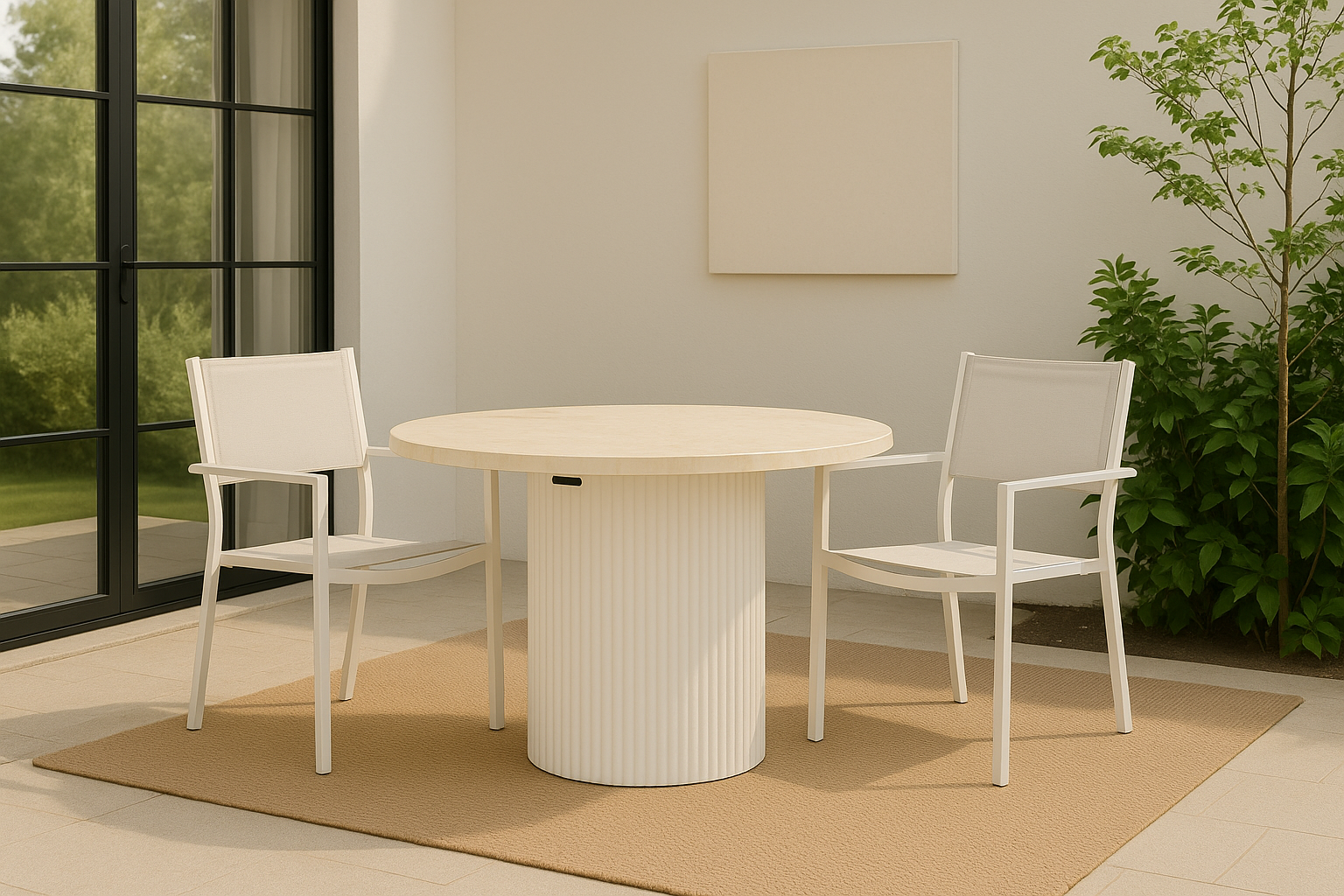 Matgrupp till uteplatsen. Runt bord med 4 st sköna mercury fåtöljer.