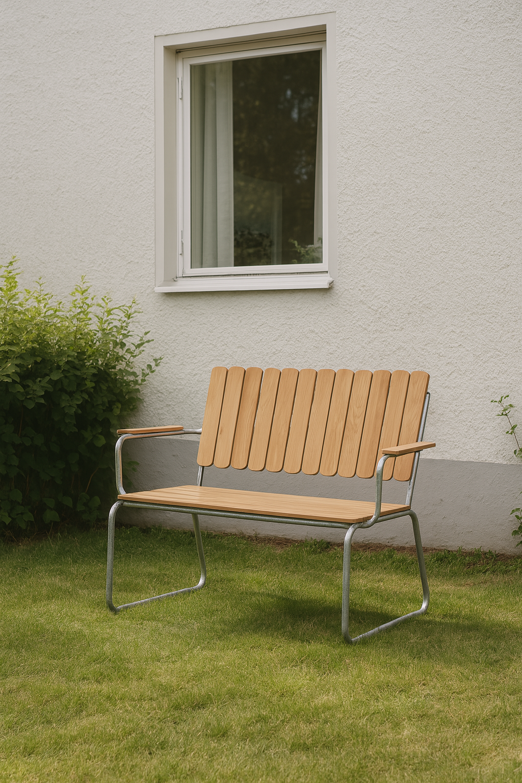 Möllan är en exklusiv serie i skandinavisk klassisk design. Utegruppen är tillverkad i galvaniserat stål med massivt oljat teakträ. Detta gör utegruppen väderbeständig och tålig för att klara uteplatsens miljö.