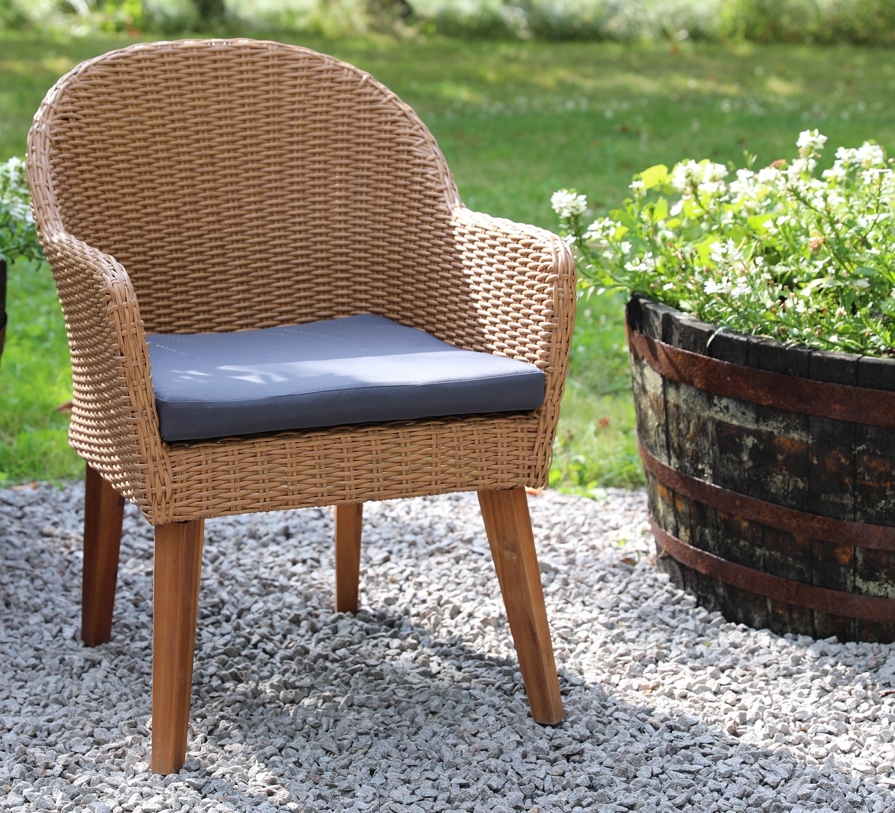 De trädgårdsstolar som medföljer i denna utemöbelgrupp är Valetta och har en fin naturfärgad konstrottning med bruna ben och en mörkgrå sittdyna. I den här utemöbelgruppen medföljer 6 stycken stolar.