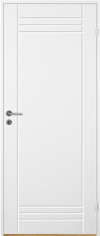 Vitmålad kompakt innerdörr med spårfräst dekor.